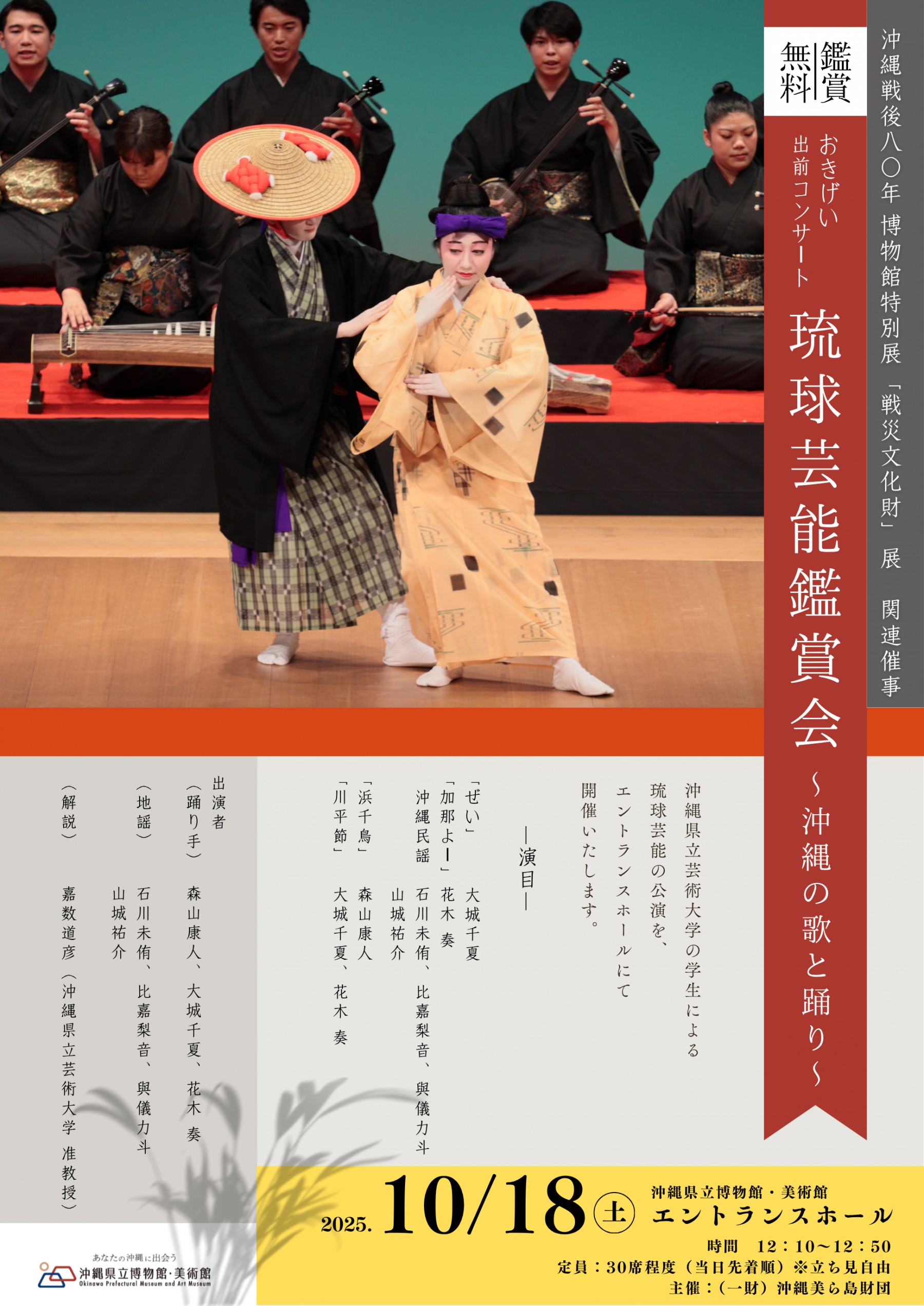 沖縄県立芸術大学の学生さんによる琉球芸能の公演を、エントランスホールにて開催いたします。