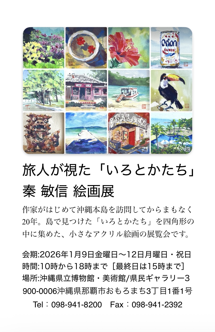 <主催者からの紹介文> 作家が初めて沖縄本島を訪問してから約20年。 島でみつめた「いろとかたち」を正方形の中に表現した小さなアクリル絵画の展覧会です。