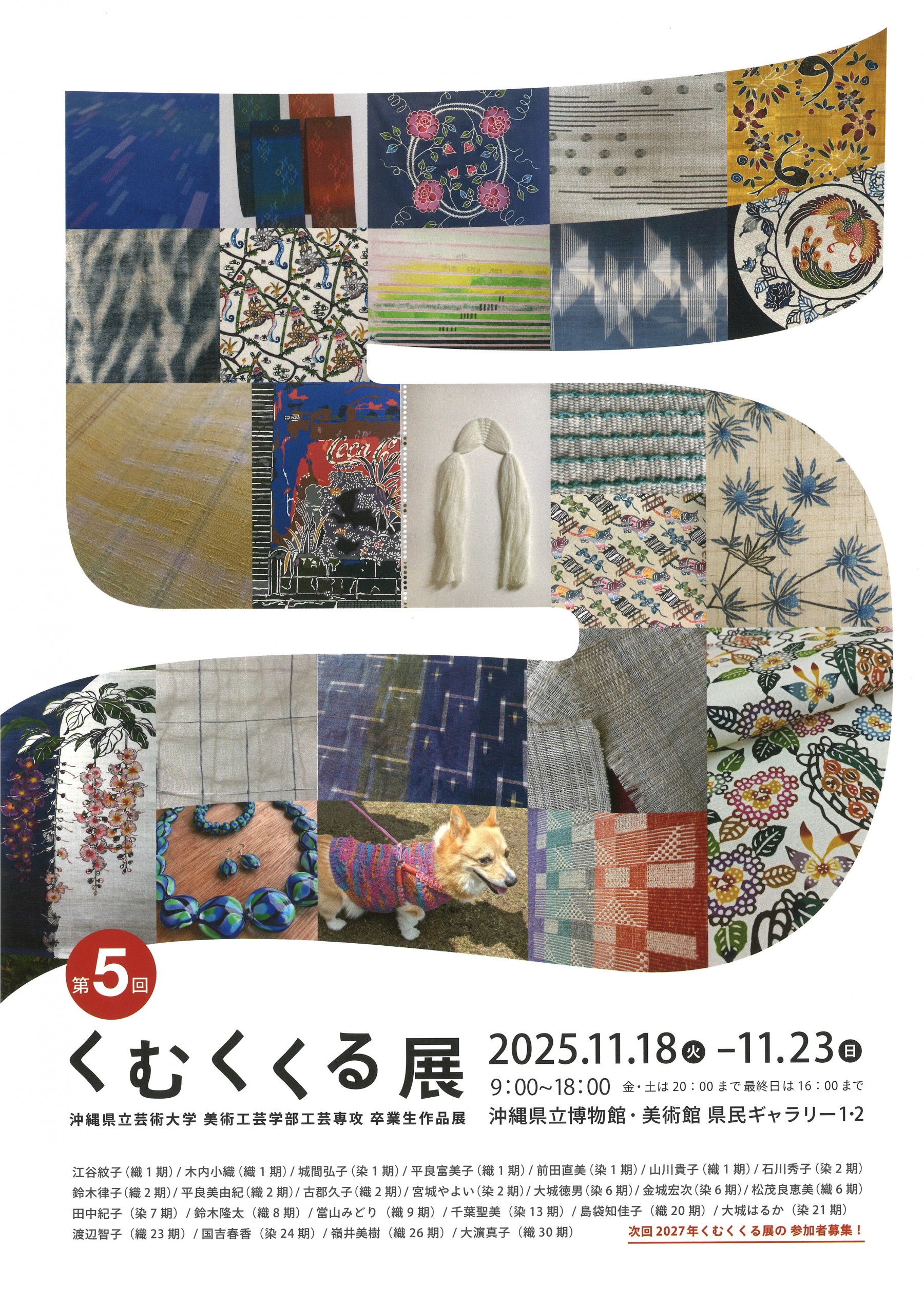 <主催者からの紹介文> 県立芸大染織コースの卒業生が「くむくくる会」をたちあげ、「くむくくる展」と銘打った染や織などの作品展示会であり、今回は第5回となる。 常時会員の募集を行っている。 作品は織布、タペストリー、着尺、帯、服飾など。