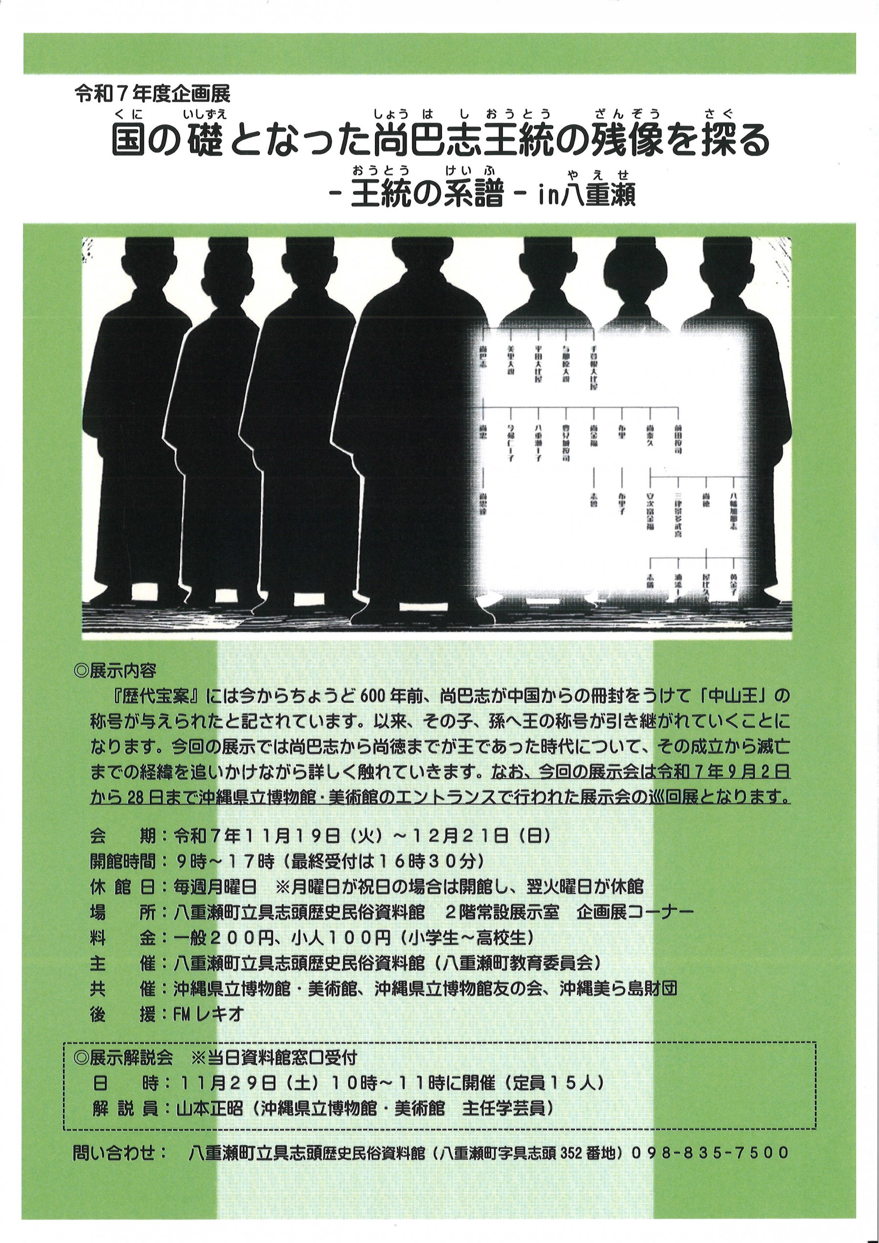 9月28日をもって閉幕した当館エントランス展示『尚巴志王統の系譜』ですが、場所を変えて八重瀬町立具志頭歴史民俗資料館にて11月18日から開催されることになりました。詳しい内容については以下になりますので、気になる方は是非ご観覧ください。