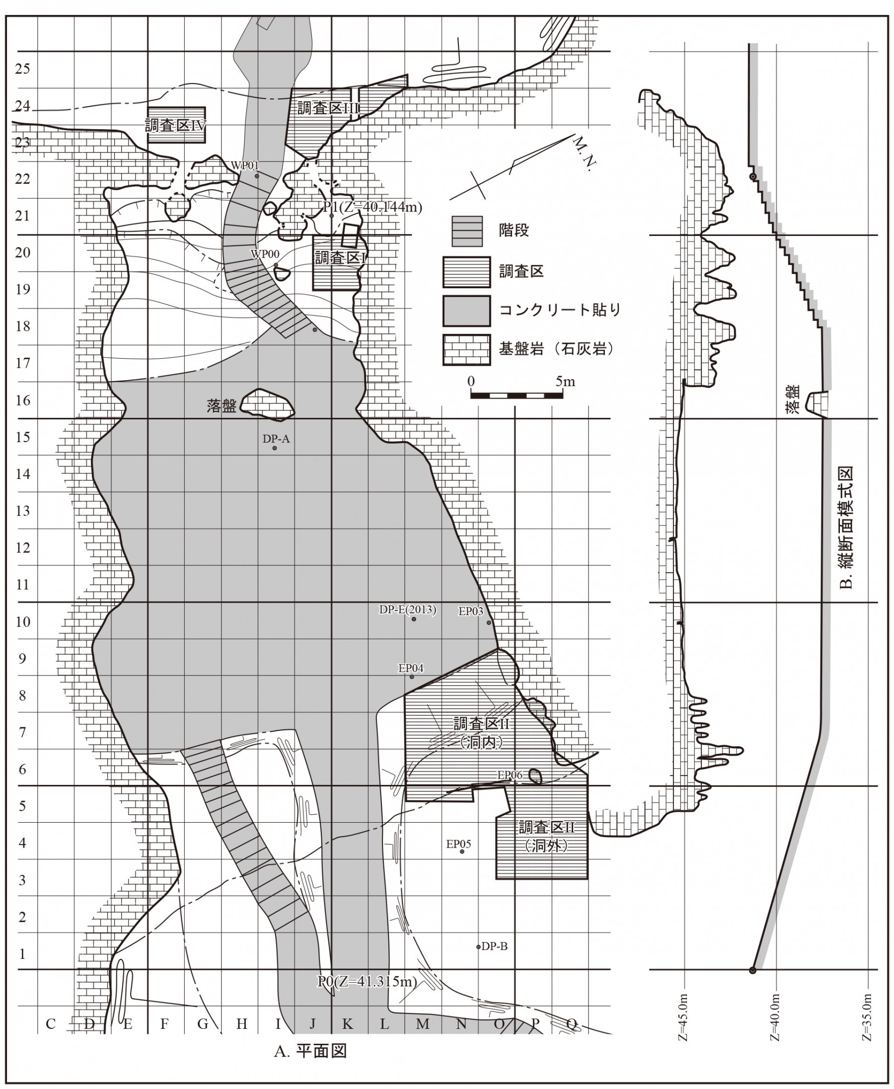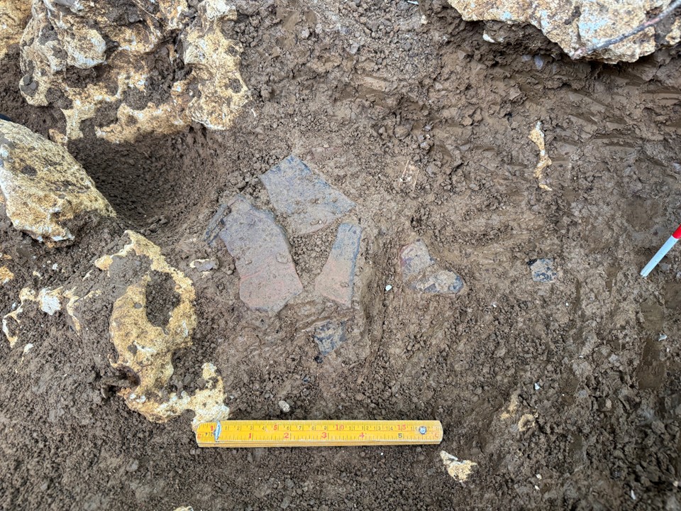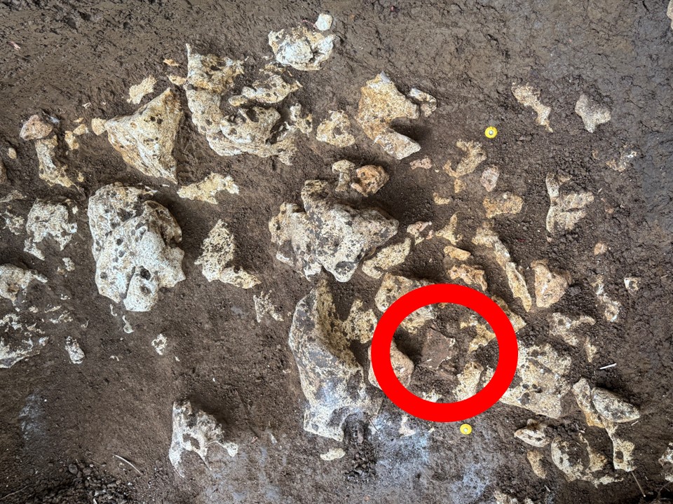 西側洞口外の調査区Ⅳでは、約5500年前頃のものと思われる炉跡や、さらに古い時代の堆積層が確認されています。今年度の調査では、追加の土器片やカニ、カワニナの遺骸等が検出されました。