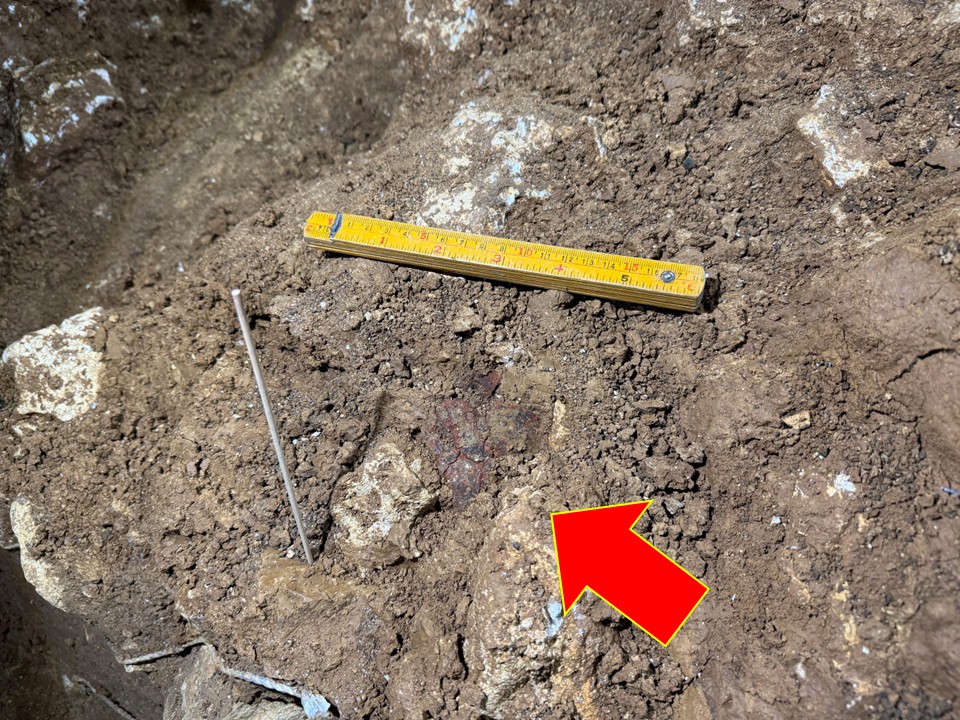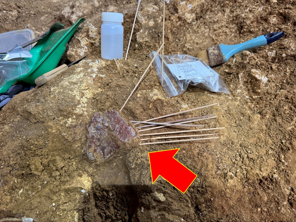 9000年前の土器はとても脆いので、接着剤で固めてとりあげます(矢印部分)。