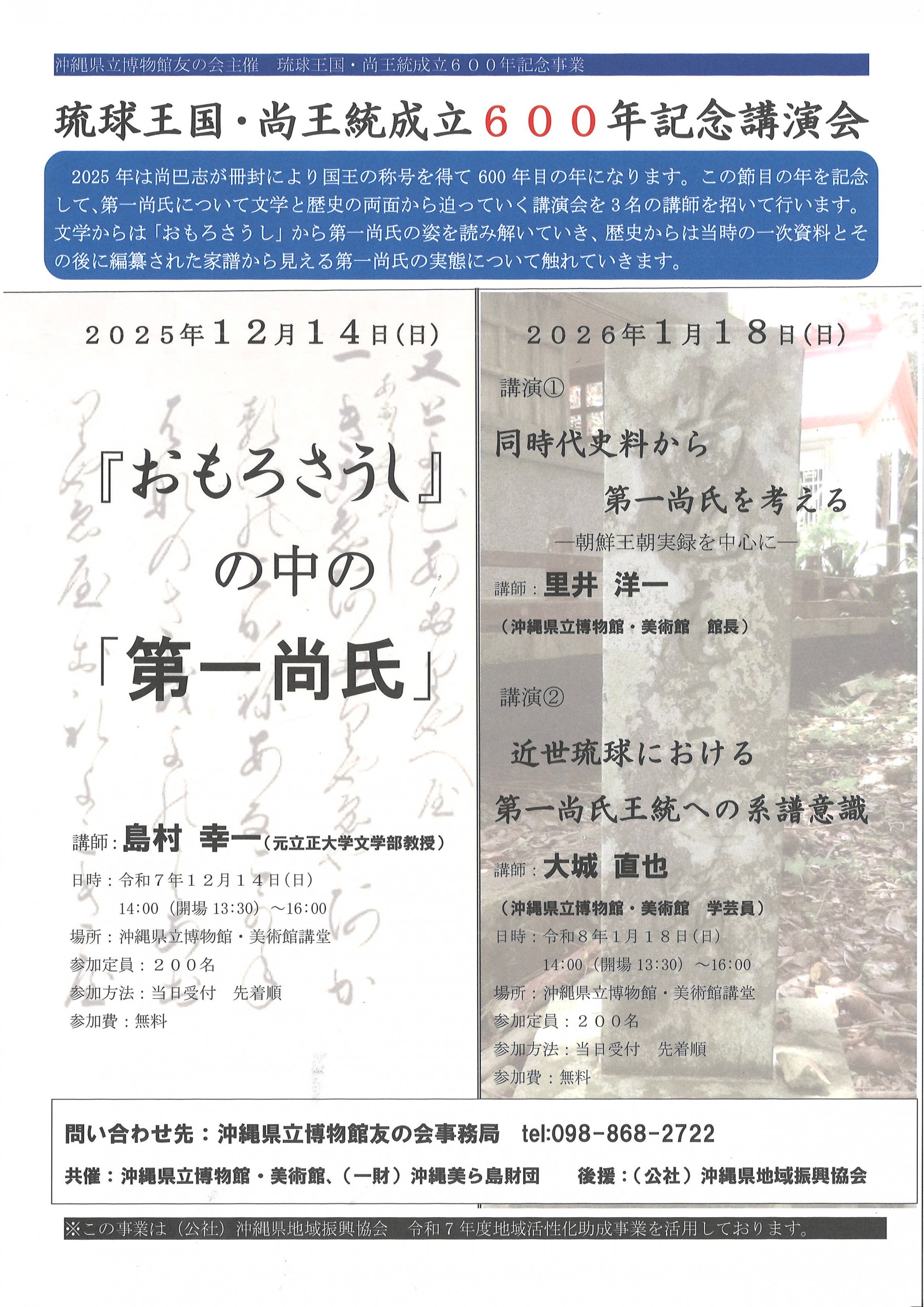 令和8年1月18日に沖縄県立博物館友の会主催の文化講演会を行います。当館館長の里井洋一、同じく当館学芸員の大城直也による第一尚氏に関連した講演をおこないます。2名の講師ともそれぞれの専門分野から第一尚氏の実態について迫っていく内容となっております。詳細につきましては下記のチラシをご覧ください。