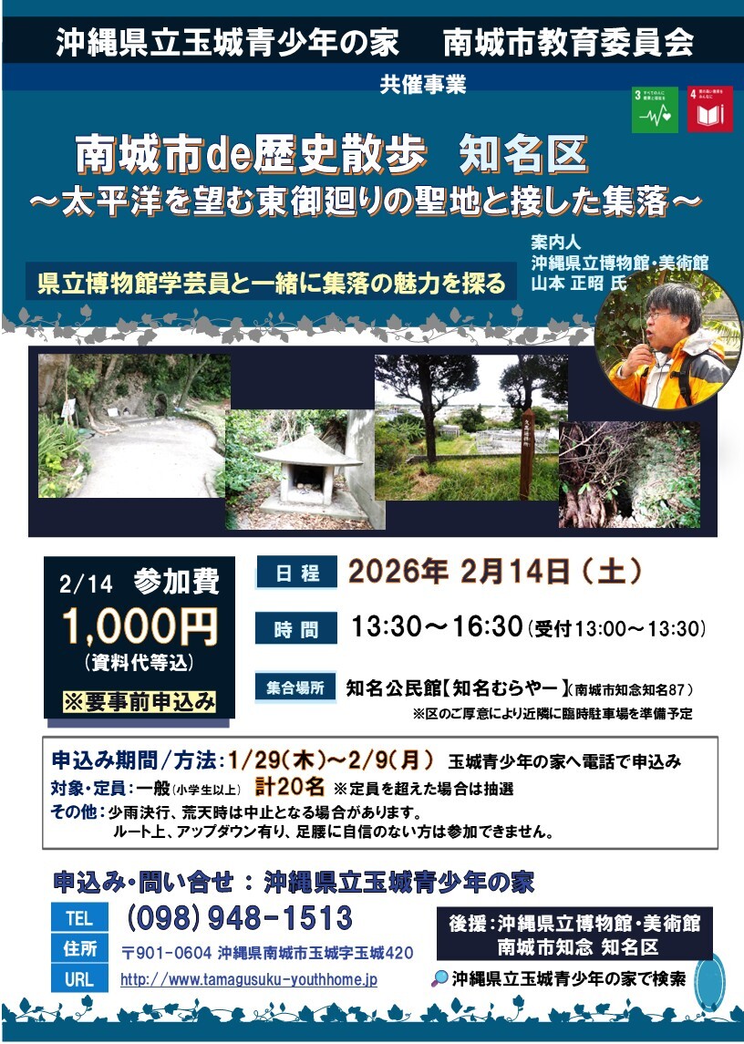 南城市知名にて知名集落内の史跡をめぐるフィールドツアーを沖縄県立玉城青少年の家が主催して実施します。知名集落内には東御廻りの巡拝地の一つである知名大川や神の島とされる久高島の遥拝所といった史跡が数多く存在しています。今回は知名集落の成り立ちについてこれらの史跡をめぐりながら知見を広げていく内容となっています。