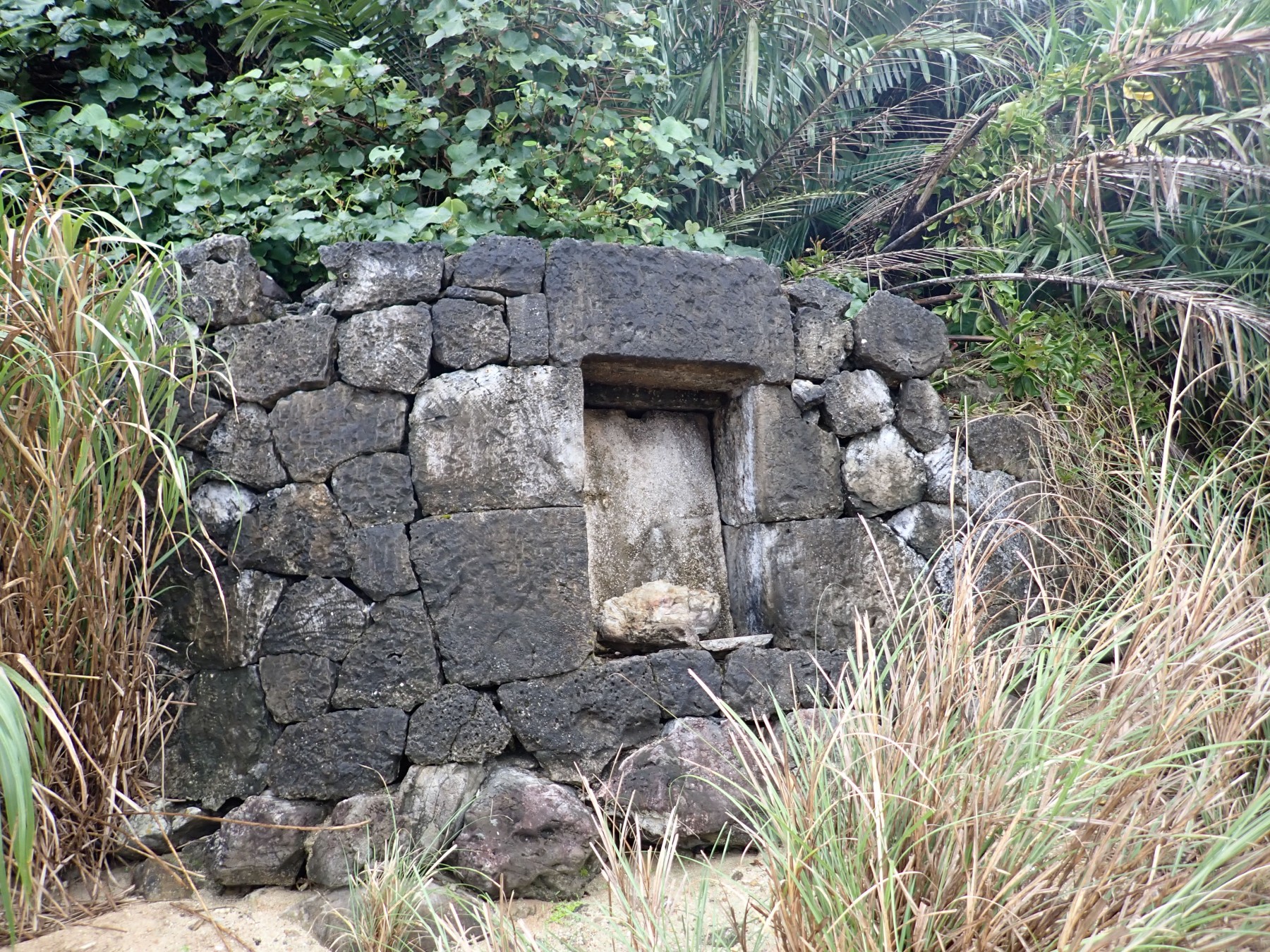 この印良苅原古墓群とは少し南に距離をおいて1基だけ、石積みを持った古墓を見ることができます。立派な切り石で立ち上げられた石積みで囲われており、天井を持たない墓です。現在の船着き場から集落跡側へ歩くとすぐに見えてきます(写真6)。