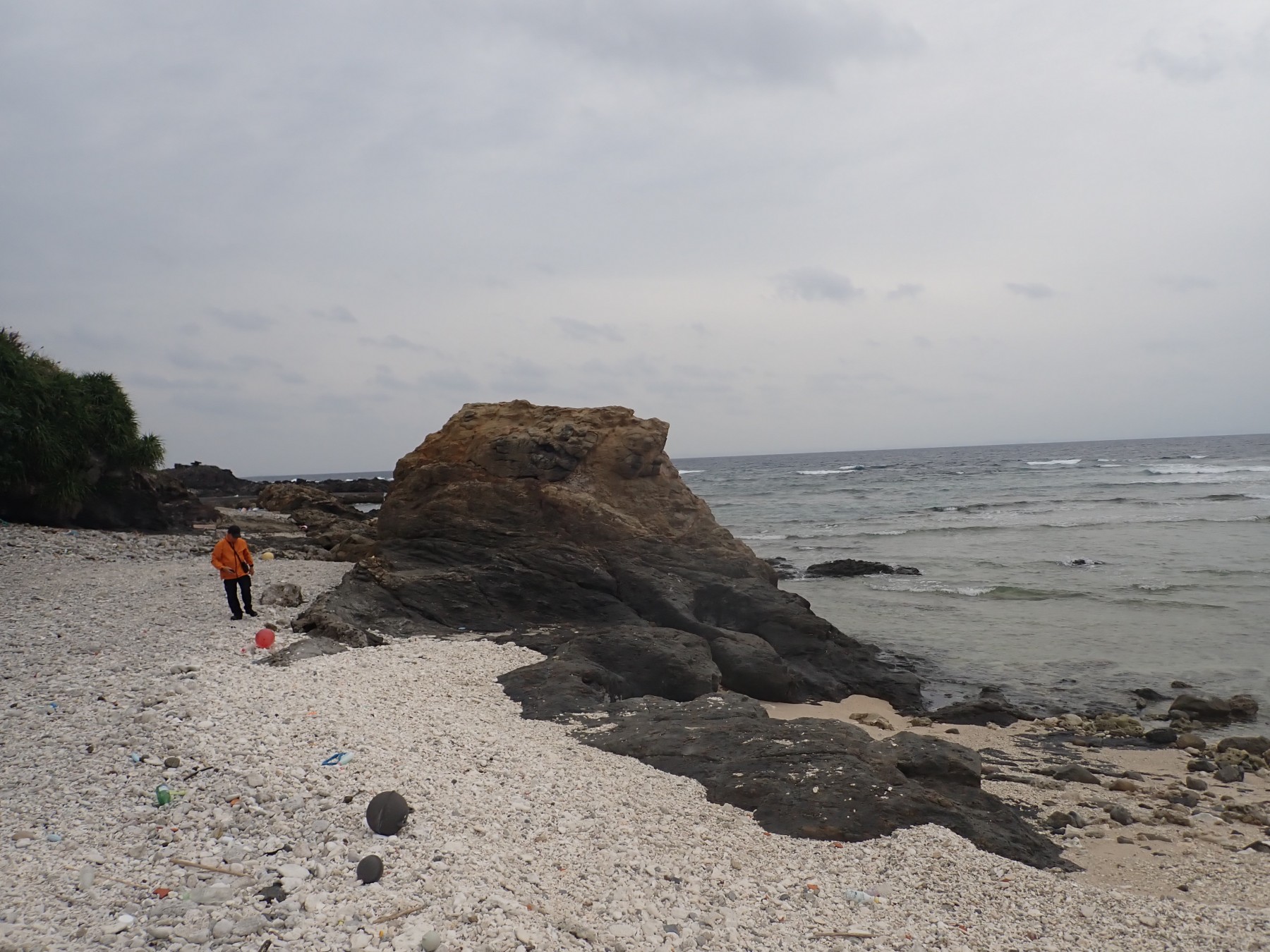 島の更に北側にはスルジヌハマ、トーエイハマといった南北に続く砂浜が続いています。トーエイハマは漢字表記では「唐栄浜」とするようで、かつて中国大陸から来航した交易船が立ち寄り、この浜で交易品の取引を行っていたという伝承がその名の由来となっています(写真8)。南北方向に海岸線沿いに200mほど広がる砂浜であることから、大型船から多くの品々がこの浜へ荷下ろしされたことが想像されます。なお、この浜周辺を過去に散策したことがありますが、残念ながら交易を示すような遺物等を確認することができませんでした。