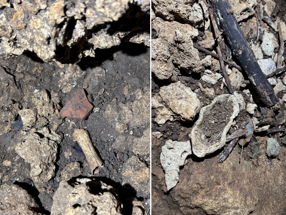 ウシの骨や陶器片(左)、シャコガイ(右)などが落ちています。