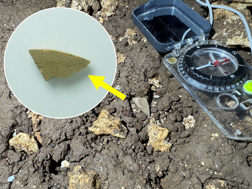 小さなかけらですが、15~16世紀頃の青磁もみつかりました。