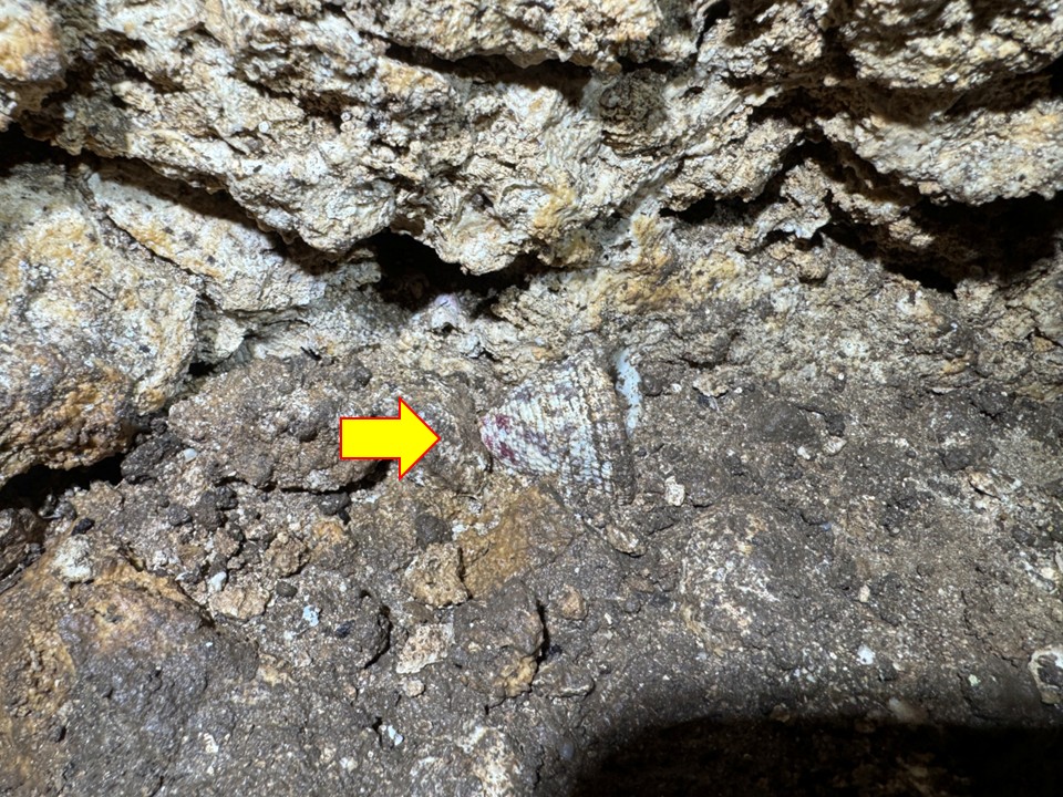 近くには巻貝(ニシキウズ)も落ちていました(矢印)。