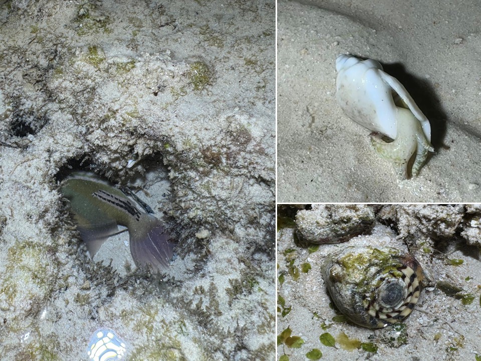 左:眠っている?魚、右上:お散歩中のネジマガキ