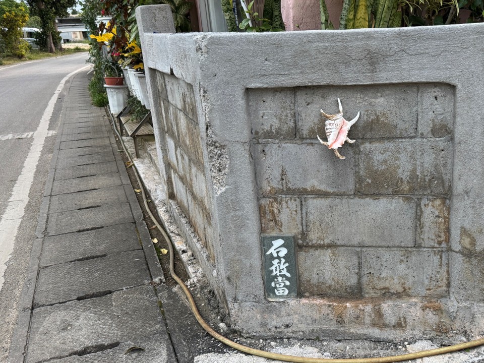 集落内の角でみかけた魔除けのスイジガイと石敢當(いしがんとう)