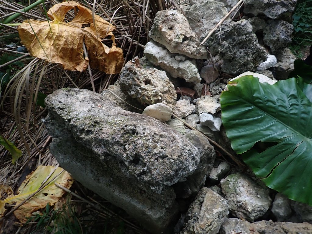 前島集落跡の石積みについては以前の学芸員コラムに詳しく触れたので、ここでは簡単に触れますが、テーブル状のサンゴ石を多用していることと、そして斜めにして組み上げていくといった特徴があります。