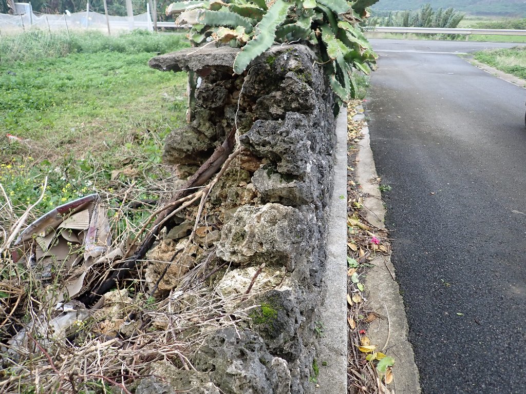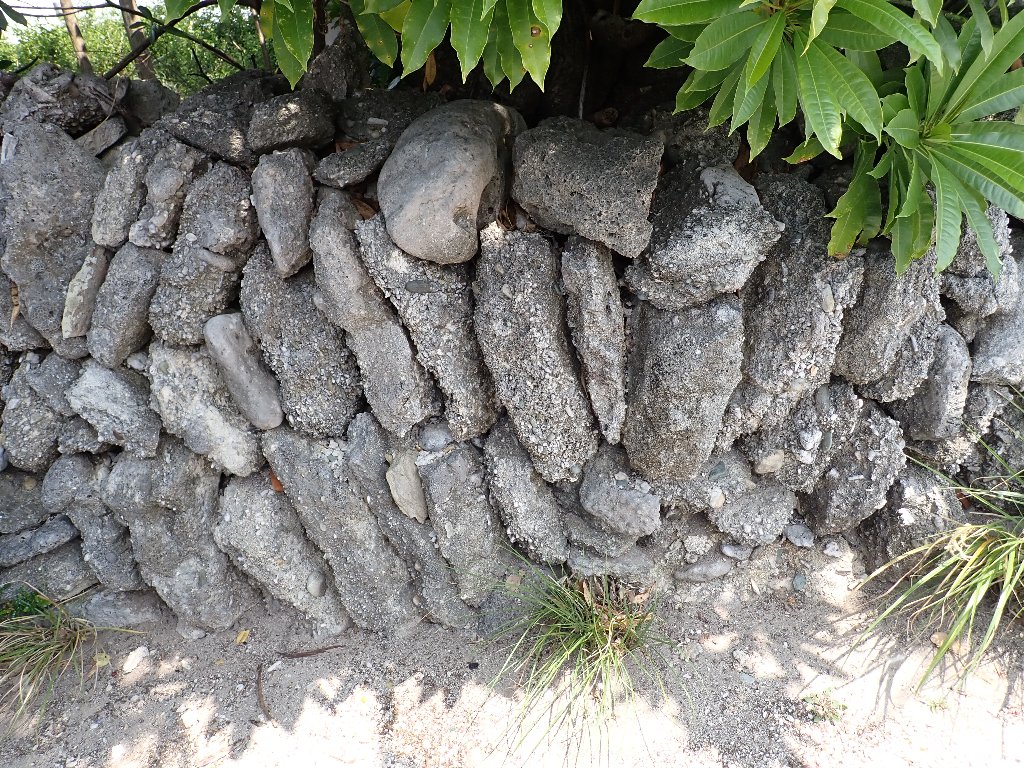 写真3 モルタルで固められた石積みの裏込め石(祖納集落)