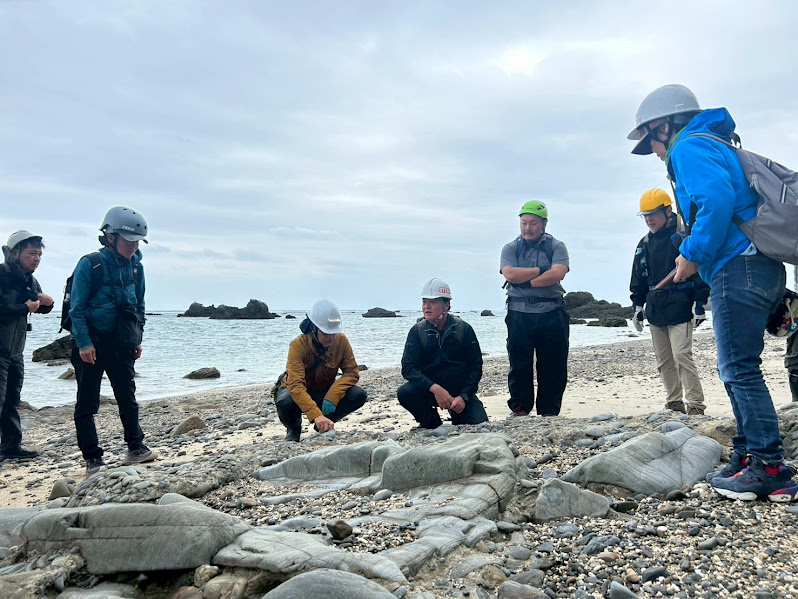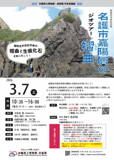 令和7年度最後の学芸員講座は、ジオツアー「名護市嘉陽層の褶曲」です。地学担当の宇佐美と、地質担当の新山学芸員で解説を担当、その他、当館の森下学芸員、大城直也学芸員、沖縄美ら島財団の石田学芸員、藤田学芸員とともに開催しました。