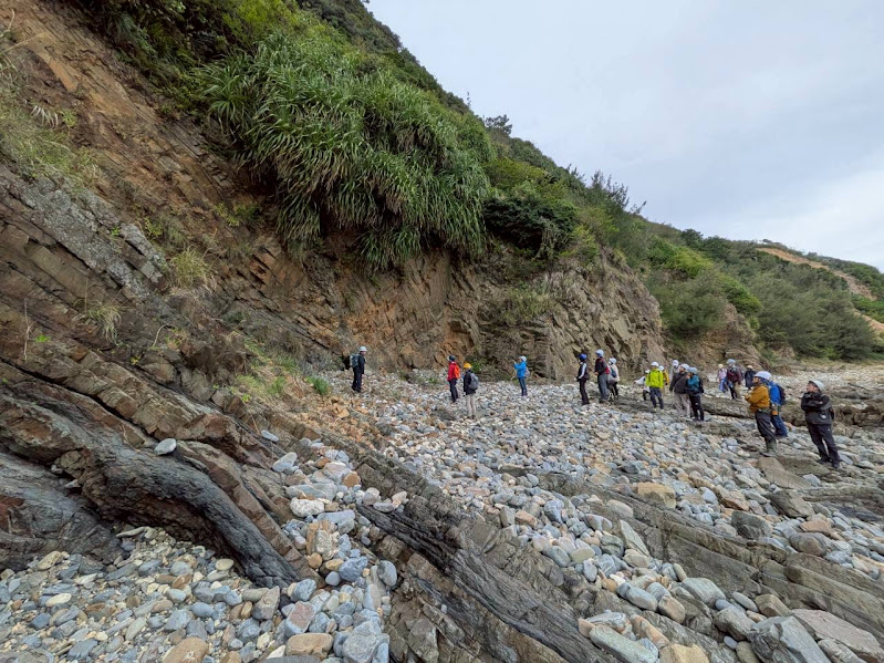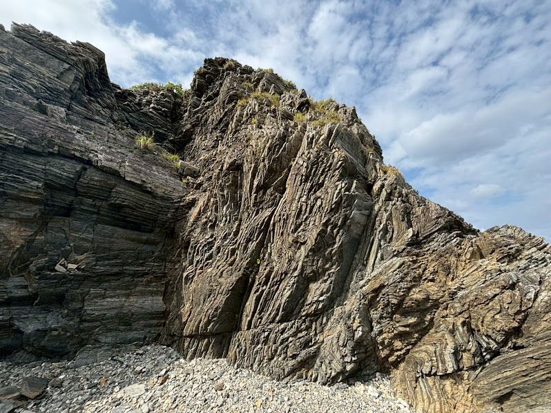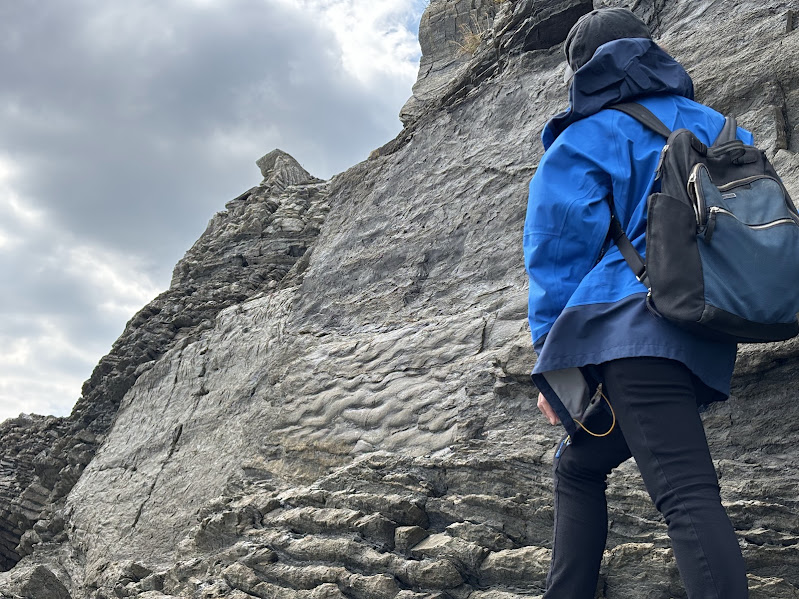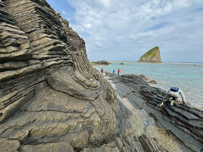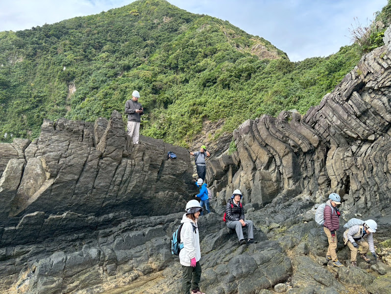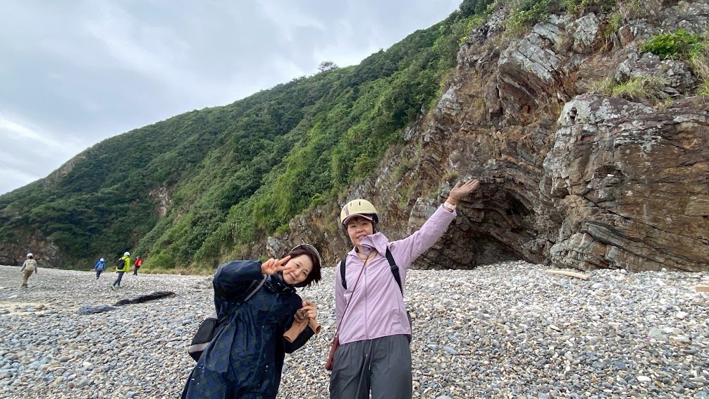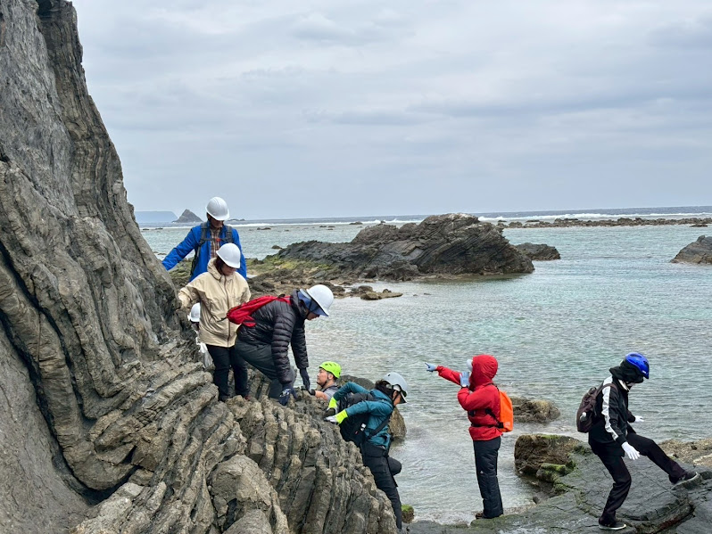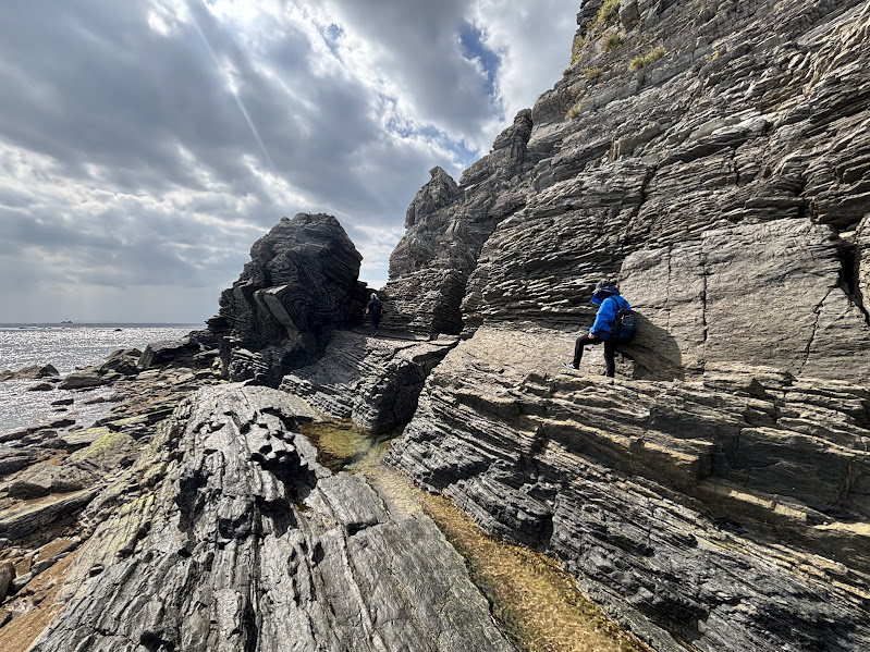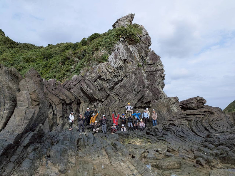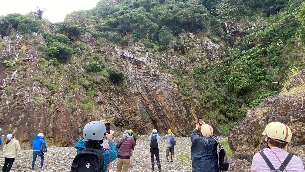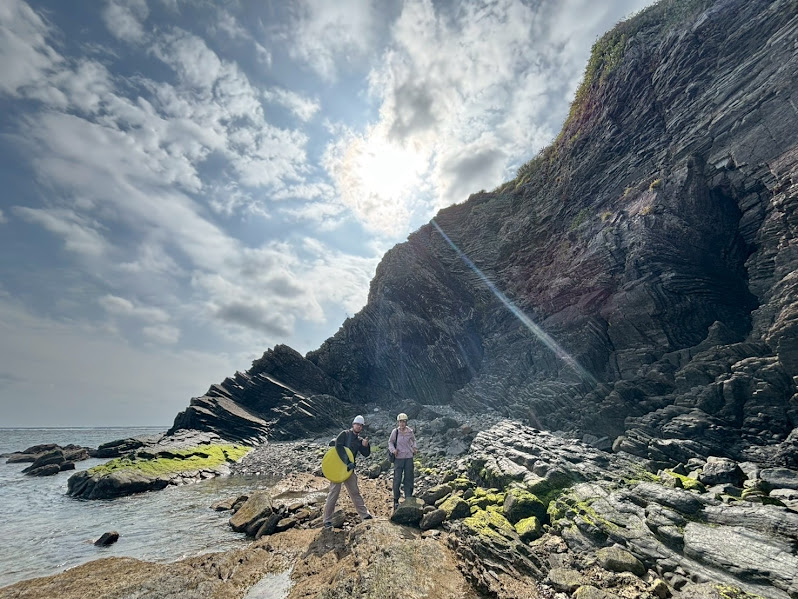 ここが最終目的地、バン崎です。何度来ても何度見ても,地球のダイナミズムと自然の壮大さを感じるたまらないポイントです。写真だけでもすごいと感じられると思いますが、現地で生の地層を見るとさらに実感します。人間が小さく見えます。