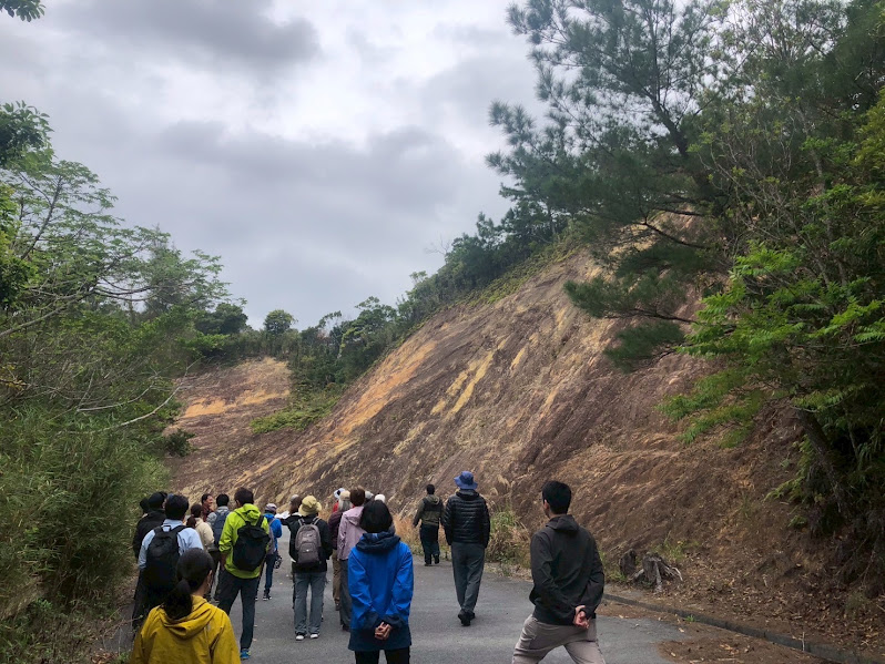 2017年度(平成29年度)、2018年度(平成30年度)の同時期にも、同じテーマで開催したのですが、2017年度は大雨で途中で中止としたとしたことがありました。詳細は、「雨のジオツアー 「名護市嘉陽層の褶曲」」をご覧下さい。