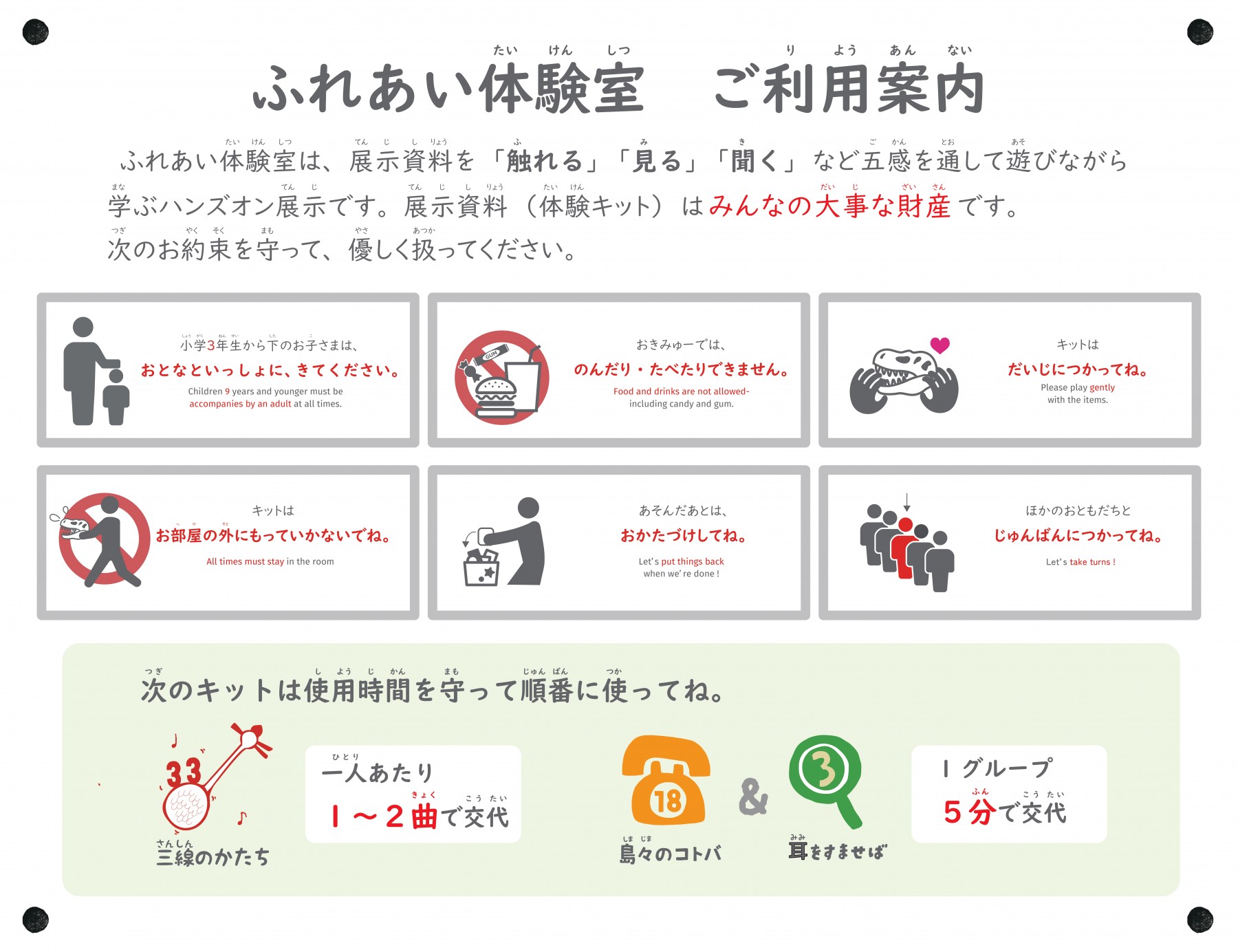 ふれあい体験室の展示資料(キット)は、みんなの大事な財産です。